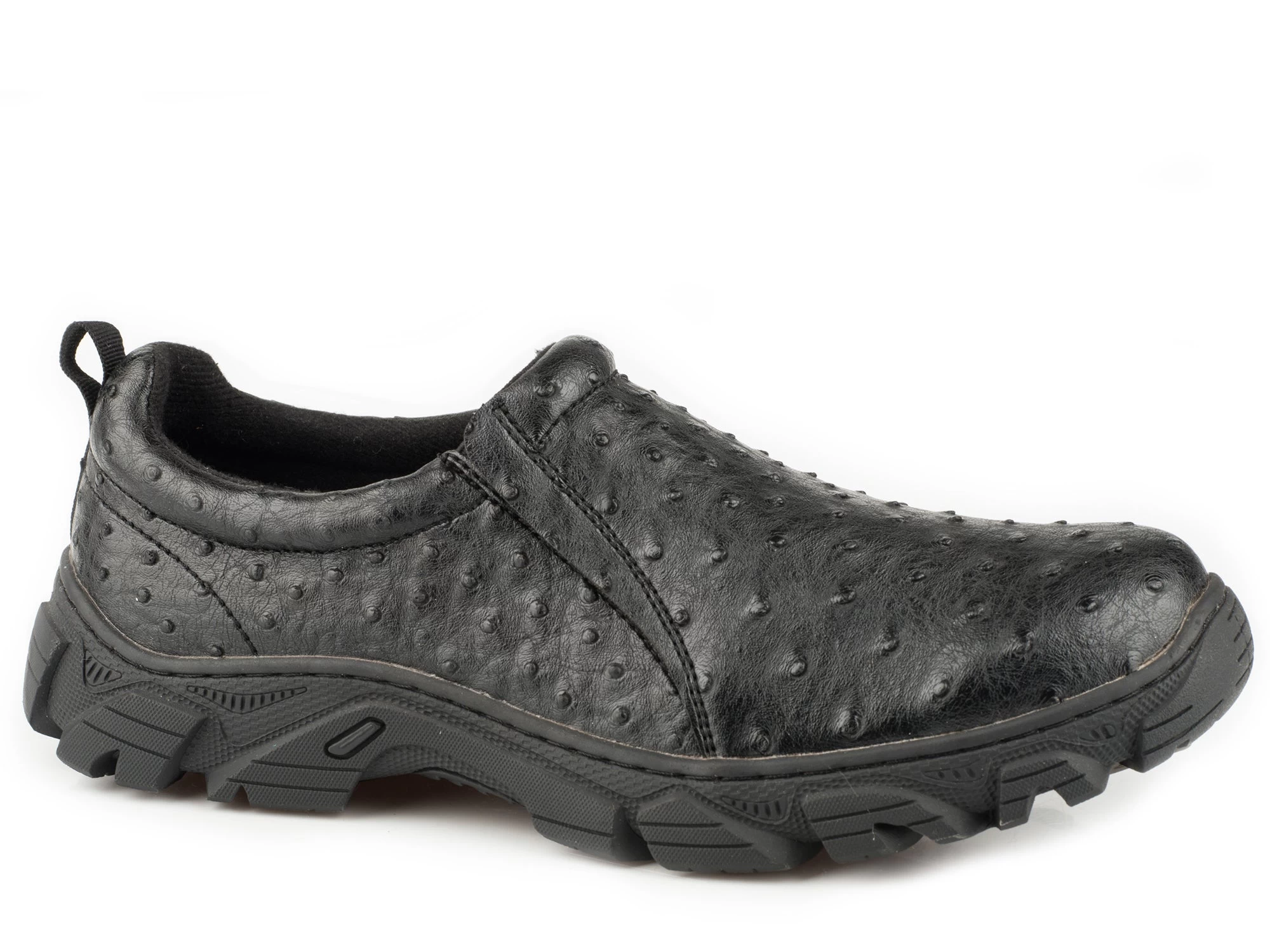 Roper Mens Black Faux Leather Ostrich Print Cotter Slip-On Shoes