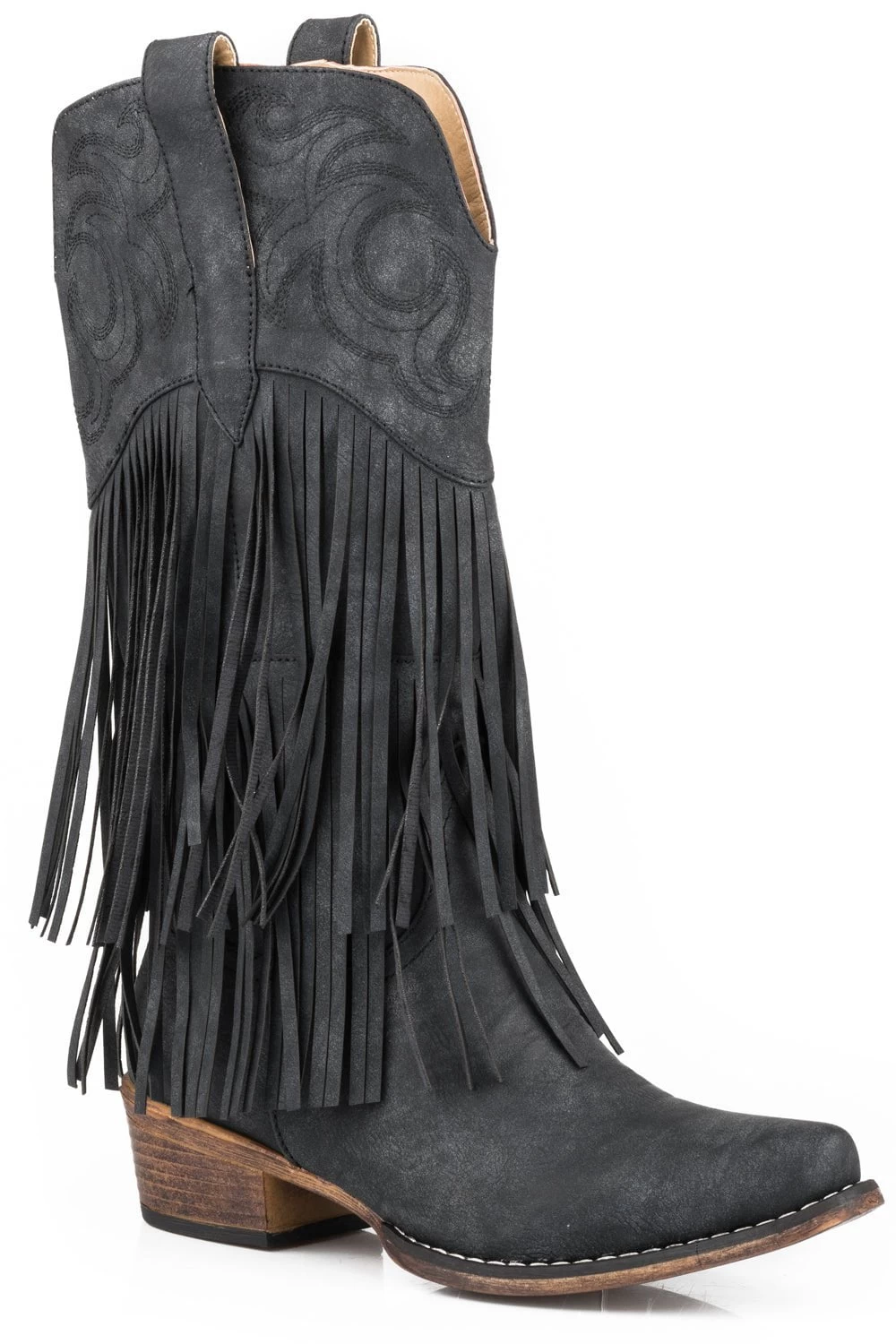 Roper Womens Black Faux Leather Rickrack 13In Fringe Cowboy Boots